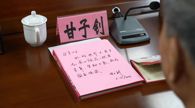 甘子钊院士欣然提笔,为梁草同学亲笔写下寄语——“愿如骏马,根若芳草,坚劲不息,成为国家栋梁。”