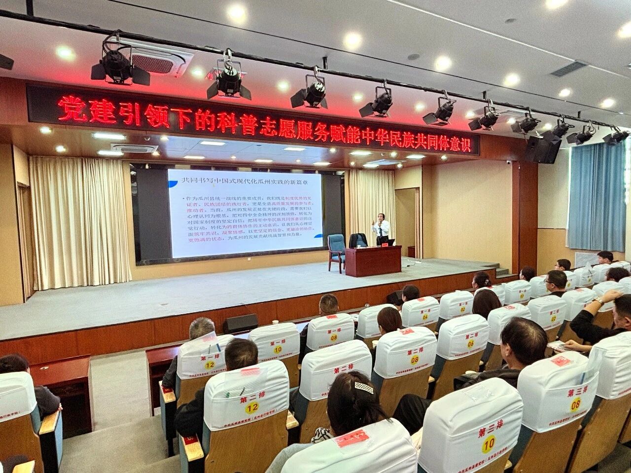 讲座上,莫兴邦教授从理论与实践相结合的维度,系统阐释了新时代科普志愿服务在铸牢中华民族共同体意识中的重要作用。围绕党建引领下科普志愿服务的工作机制与实践路径,莫兴邦教授结合瓜州实际,他建议充分挖掘本地资源优势,推动民族文化、地域文化与现代科技知识有机融合;创新数字化服务方式,提升科普精准性与有效性;健全激励机制,吸引更多专业人才加入志愿服务行列,形成持续发展的良好态势。