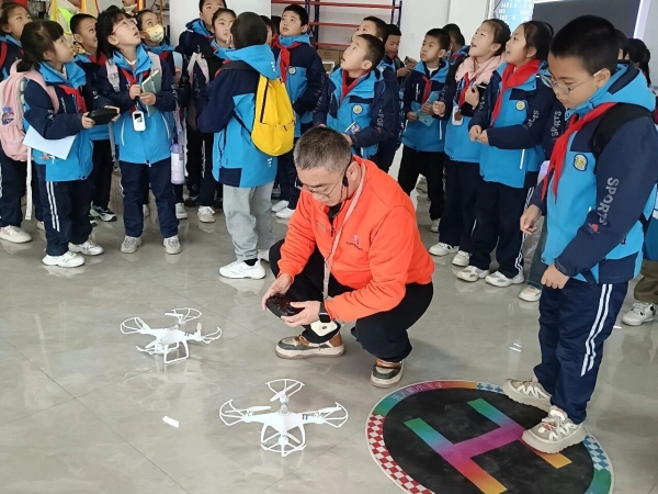 在崇信县城区第二小学,无人机编队表演率先拉开序幕,灵活穿梭的机身伴随着红歌音乐变换队形,引发全场阵阵欢呼。无人机表演结束后,润鑫科普中心的技术人员还为科技老师们进行了答疑解惑,从无人机教学场景设计到设备维护技巧,面对每一个问题,工作人员都耐心解答。