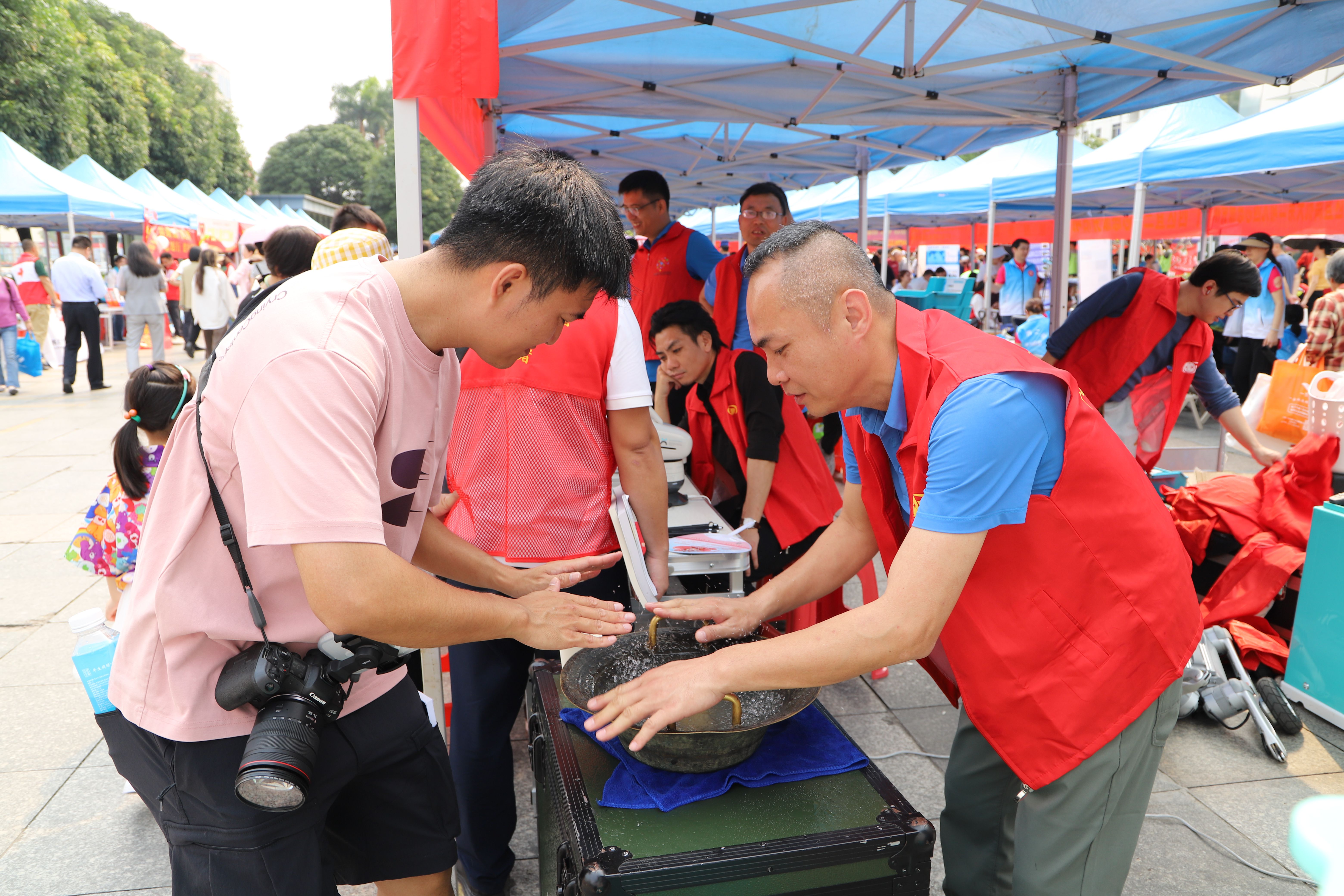 活动现场,便民利民、健康义诊、共建平安、政策咨询、生态环保等服务有序开展。在便民利民区,义务理发、家电维修、手机贴膜、便民磨刀等服务项目前排起长队,志愿者们用精湛技艺解决群众生活“小难题”。健康义诊区内,来自中医科、心血管内科等领域的专家现场坐诊,提供血压血糖测量、中医脉诊、颈肩腰腿痛筛查等服务,并手把手传授心肺复苏等急救技能,将健康守护送到群众身边。政策咨询区则围绕税收优惠、社保缴纳、权益保护等热点问题,为市民提供面对面答疑,让惠民政策“触手可及”。共建平安与生态环保服务区通过消防装备体验、垃圾分类互动游戏等形式,在寓教于乐中提升市民的安全意识与环保理念。