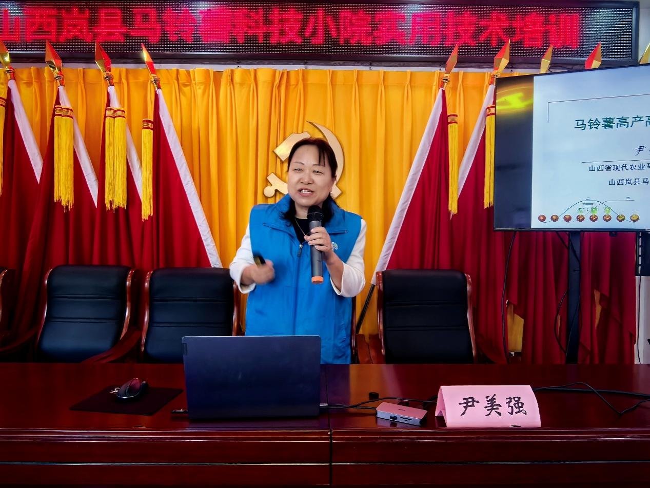 培训现场,山西岚县马铃薯科技小院、山西省现代农业薯类产业技术体系岗位专家尹美强教授围绕马铃薯水肥管理技术、马铃薯高效生产技术关键环节进行详细讲解。在水肥管理技术方面,详细阐述了马铃薯不同生育阶段水肥需求规律、钾肥在马铃薯生产中的作用以及马铃薯中后期管理;马铃薯高效生产技术方面,深入分析如何提高产量、提高价格、降低成本等要点。