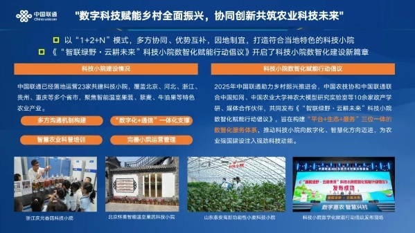 这些科技小院采用“1+2+N”协同模式,以1个核心技术团队为支撑,2个共建主体为依托,服务N个农户及合作社,实现“一地一特色、一院一方案”。展台上,由中国联通与中国农村专业技术协会联合印发的《科技小院数智化赋能工具手册(1.0版)》尤为亮眼,该手册是《“智联绿野・云耕未来”科技小院数智化赋能行动倡议》的重要落地载体,更为全国科技小院数智化升级提供了“联通样板”。