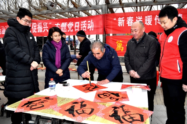 墨香溢乡村,春联送吉祥。活动现场,红彤彤的春联、金灿灿的福字铺展成阵,墨香与欢声笑语交织在一起,勾勒出最浓郁的年味。春联福字书写区前,来自聊城市青年书法家协会、东昌府区书法家协会的书法爱好者与志愿者们挥毫泼墨、笔走龙蛇,“马跃春风开盛景,民安科技惠民生”“政策暖心千村富,科学助力万户兴”等一副副兼具时代气息、科技内涵与吉祥寓意的春联跃然纸上,一笔一画承载着新春的祝福,一字一句寄托着对美好生活的期盼,被群众争相领取,将满满的年味与暖意带回家中。